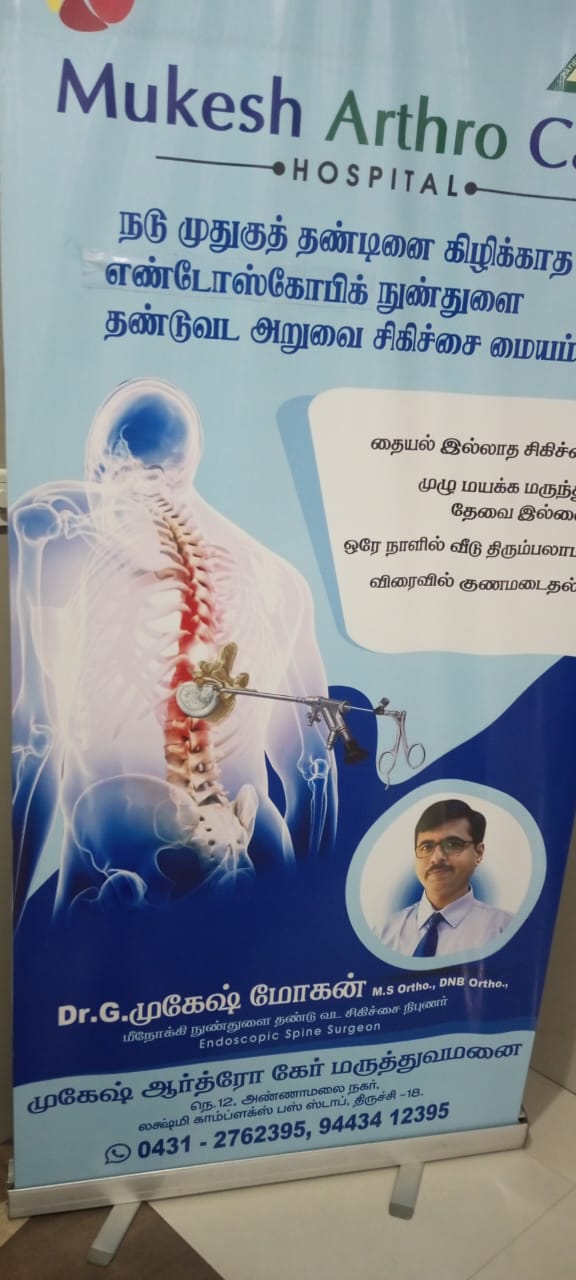 knee joint doctor in woriyur Mukesh Arthro-Ortho-care Hospital Dr Mukesh Mohan is It can range from a dull, constant ache to a sudden, sharp pain that may shoot down the leg. Sometimes it can come on suddenly – from an accident, a fall, or lifting something heavy, or it can develop slowly because of age-related degenerative changes in the spine.
